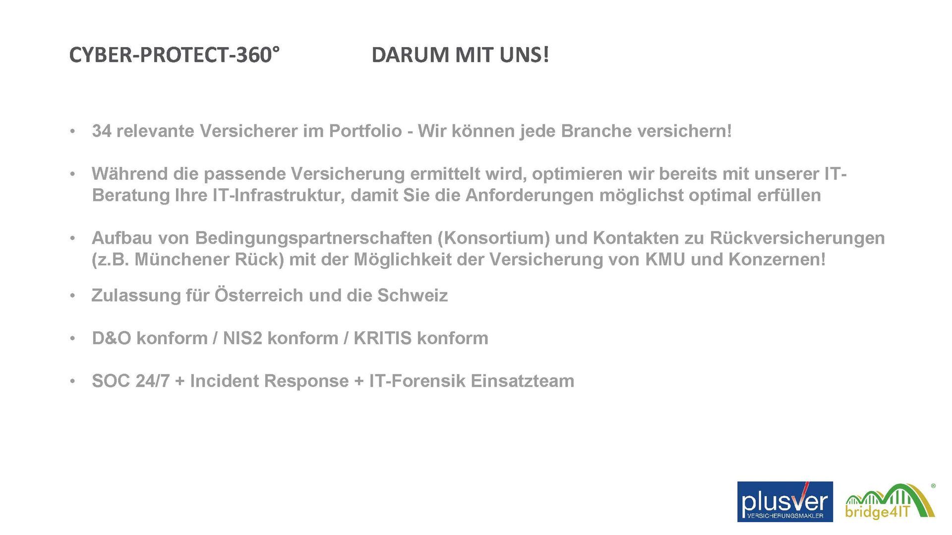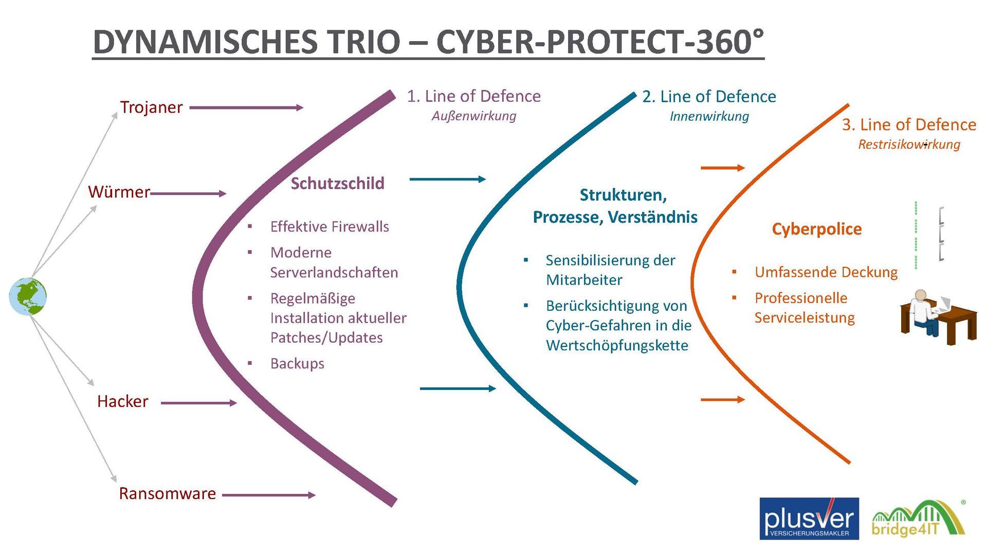 Die IT ein Stück sicherer zu machen, erfolgt bei uns mit Übersetzungen von IT-Themen in die verständliche Sprache des Geschäftslebens. Wir führen Sie und begleiten Sie durch den Dschungel der Begriffe und der Komplexität. Ein gut durchdachtes Cyber-Sicherheits-Paket ist der beste Weg, um Ihr Unternehmen zu schützen. Und das in Zusammenarbeit mit dem Cyber-Versicherungsspeziallisten Plusver.